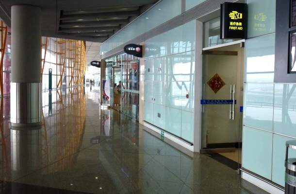 The First Aid station is one floor up, on the second floor towards the left side of the terminal.